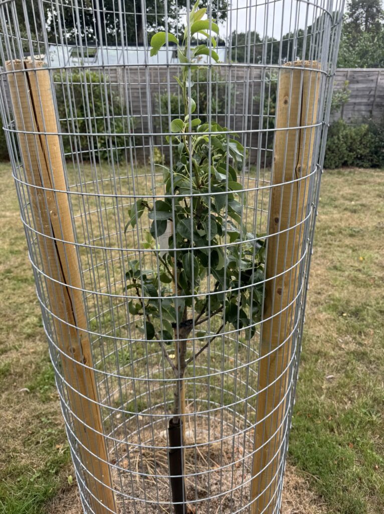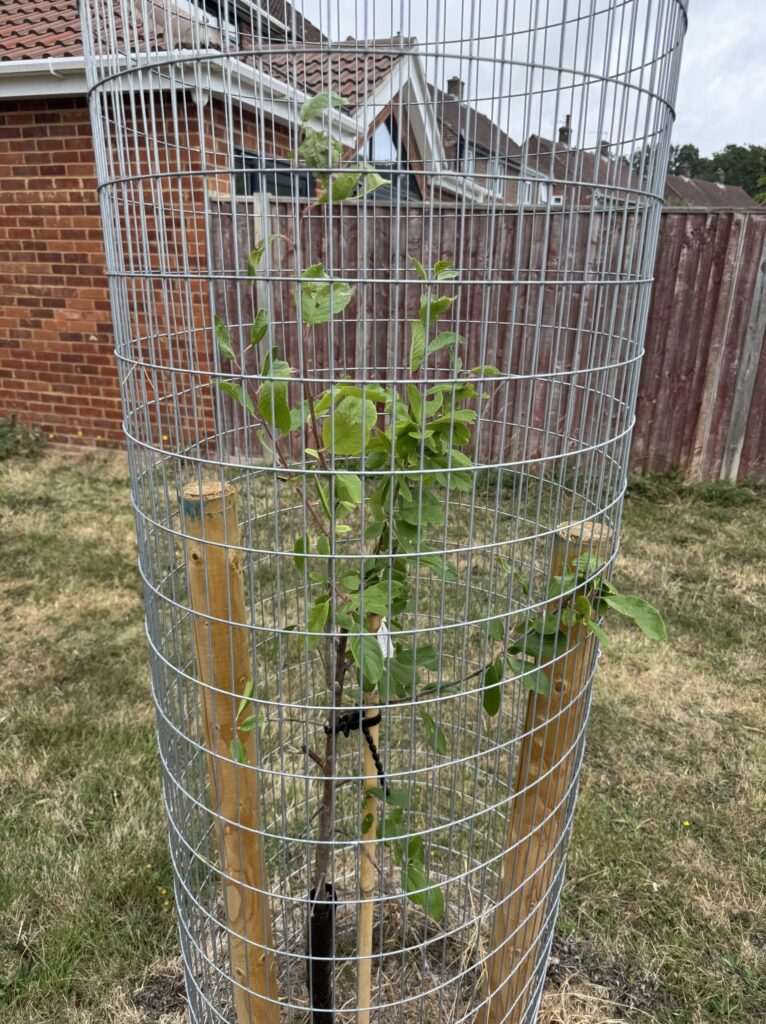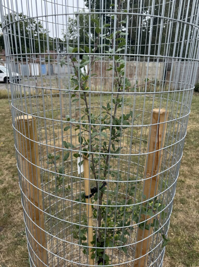 On 2 March 2025 we tested the process for adding guards to the trees in the orchard to protect against wildlife, accidental damage (from grass cutting, for instance) and also vandalism. The process was carefully worked out and on 5 April 2025 a small group completed the task of adding guards to all 22 trees. Many thanks to Nigel Williamson, Chris Evans, Rhys Clark, Russell Clark, Anne Ayres, Laurie Ayres and Colin Cooper for their hard work.
