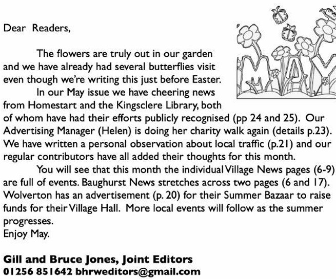 This page contains an electronic copy of the May 2025 issue of the Parish News magazine, which contains information and articles about Baughurst, Hannington, Ramsdell and Wolverton.
