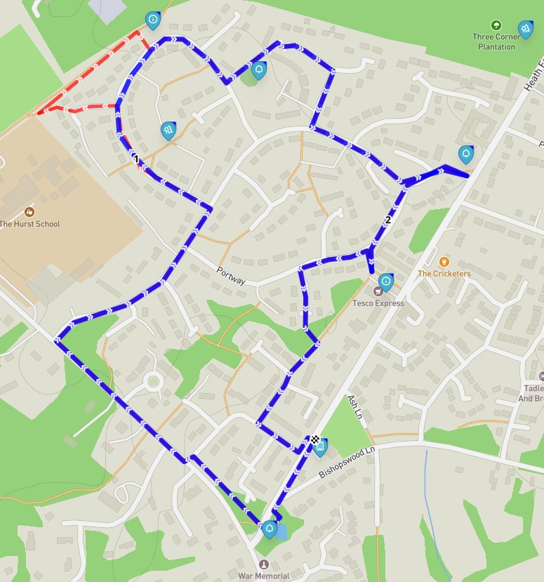 - Walk along Wellington Crescent and cross Heath End Road to finish.