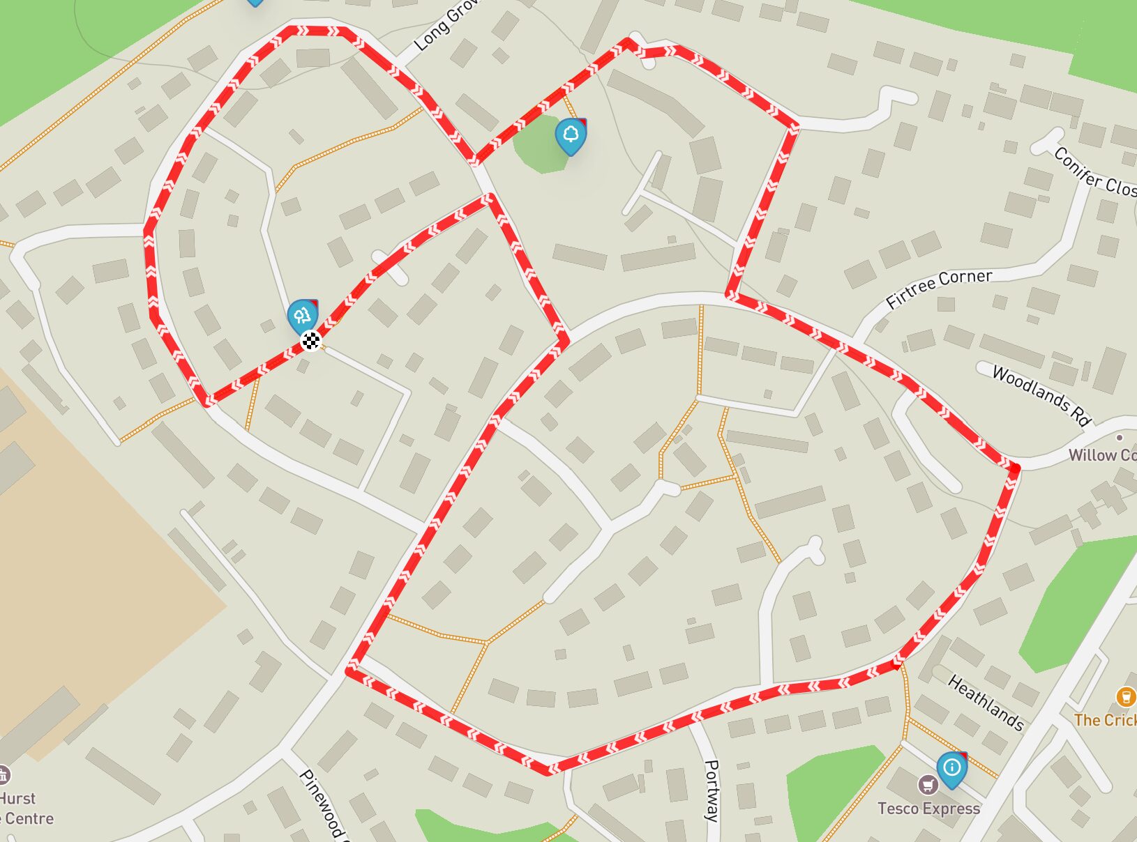 - Follow Woodlands Road until you reach the T‑junction with Long Grove. Don’t turn here — it’s far too spooky! Instead, keep going until you reach the second entrance to Long Grove on your left.